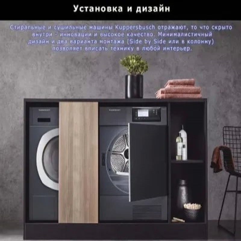 Сушильная машина Kuppersbusch T 40.0 AT AnthraciteПрограммы/дополнительные программы: Автоматические программы для хлопка и немнущихся тканейОт степени сушки «под утюг» до «экстра-сухое»Специальные программыСушка в корзине, Удаление пыльцы, Смешанное, и другие программы: Рубашки, Джинсы, Синтетика, Шерсть, Спортивная одежда, Пух/ подушки, Махровые полотенца, Пропитка, Шелк, Освежить (10-90 минут), Отсрочка старта (10-150 минут)ИзбранноеСохраняет до 6 Ваших любимых программДополнительные функцииАнтибактериальная обработка, Бережный уход +, Сушка +, Отсрочка старта, Экспресс8 кг белья будут полностью высушены за 96 минут («в шкаф»)Лимитированная коллекция в цвете антрацитПреимущества: Большой цветной дисплей 4,3’’Корзина для сушки деликатных тканей и спортивной обувиСушильная машина конденсационного типа с технологией Heat Pump и система самоочистки Autoclean для эффективного использования электроэнергии на протяжении всего срока службы машиныВысший уровень эффективности конденсацииПрограмма антибактериальной обработки для гигиенической сушки бельяПрограмма «Удаление пыльцы» позволяет очистить ткани от пыльцыПревосходная шумоизоляция, макс. 61 дБ(А)Светодиодная подсветка барабанаЗащита от складокЭлектронная система измерения остаточной влажности бельяИндикация хода программы и времени до окончания программы, отложенный запуск – до 7 днейРегулируемый по интенсивности акустический сигнал окончания программыУгол открывания люка – 180°, диаметр люка – 36/31 смВозможность перенавески люка (правая/левая)Защита от детейКонтроль температурыСпециальные программыСушка в корзинеВлажные вещи из шерсти желательно как можно меньше подвергать воздействию, так как они имеют тенденцию сморщиваться и садиться. Спортивная обувь может повредить барабан из-за своего веса. Использование корзины позволяет выполнять деликатную сушку без перемещения отдельных стойких к машинной стирке предметов: шерстяные изделия, спортивную обувь из синтетических материалов или искусственной кожи, шапки, велосипедные шлемы, мягкие игрушки, игрушки и пр.СмешанноеЭта программа оптимально подходит для сушки смешанной партии белья из хлопка и синтетикиДругие программыИспользуйте эти программы для оптимальной сушки различных видов текстиля, например сорочек, блузок, джинсов, шерсти и пр.Дополнительные программыАнтибактериальная обработкаПри выборе этой программы увеличивается время дополнительной сушки, что позволяет уничтожать большинство бактерийБережный уход плюсДля бережной сушки деликатных вещей. Температура сушки пониженаОтсрочка стартаС помощью данной программы запуск программы можно отложить на более позднее время в соответствии со своим привычным образом жизни (например, для использования льготного ночного тарифа на электроэнергию)Сушка +При выборе этой программы временно увеличивается степень сушки — на время работы выбранной программыВремяПри открытии программы с управлением по времени отображается минимальное время выполнения программыЭкспрессДля быстрой сушки небольшой партии или отдельных изделий из хлопка, синтетики или смешанной тканиХарактеристики:Конденсационная сушильная машина с технологией Heat PumpЗагрузка 1-8 кгСтационарная установка/установка в колоннуНавеска люка левая/праваяВозможность изменения навески люкаРазмеры п